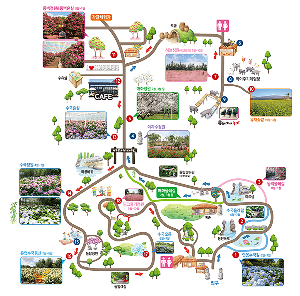 휴애리는 단순히 꽃만 보는 곳이 아닙니다. 실내 온실에는 봄 수국이, 야외 정원에는 대형 여름 수국과 유럽 수국이 장관을 이루며, 꽃마다 각기 다른 색감을 뽐내 인생샷을 남기기 딱 좋아요. 곳곳에 마련된 분홍 벤치, 나무 그네, 유럽풍 조형물은 SNS에서 자주 보이는 인기 포토존입니다. 또한 수국 외에도 수련, 장미, 야생화 등 다른 계절 꽃들도 함께 감상할 수 있어 다양한 사진 구성이 가능합니다.