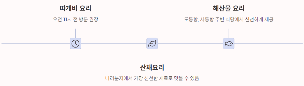 따개비, 약소, 산채나물 등은 울릉도 외 지역에서는 접하기 어렵습니다. 특히 따개비칼국수와 따개비 죽은 아침 시간대에 빠르게 소진되므로 일찍 방문하는 것을 추천합니다.