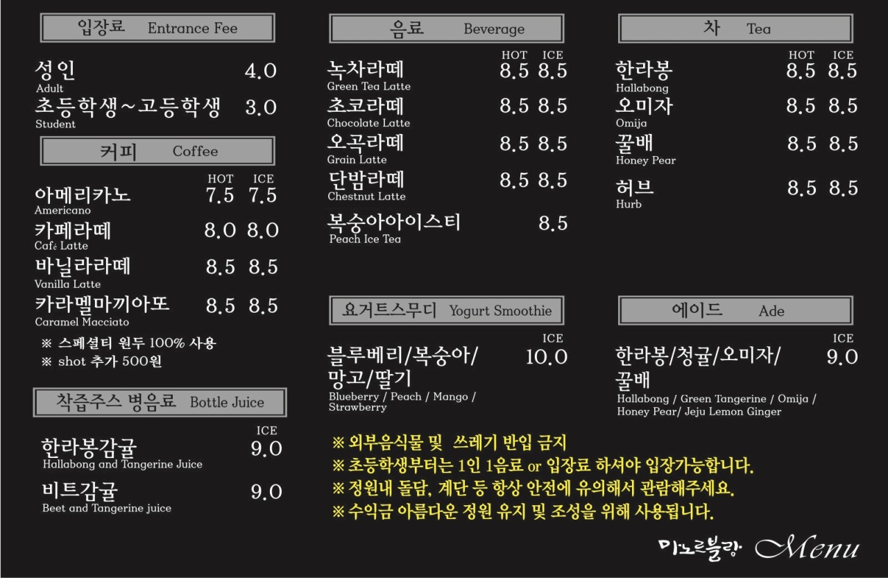 | 입장료 | 성인 4,000원, 학생 3,000원 (음료 주문시 무료) |
