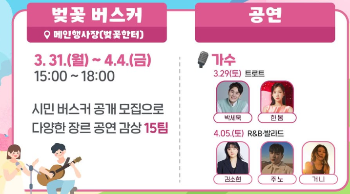 대청호 벚꽃축제에서는 봄날의 감성을 더해줄 다양한 음악 공연이 펼쳐집니다. 버스커들이 자유롭게 공연을 펼칠 수 있는 무대가 마련되어 있어, 지나가던 길에 우연히 멋진 음악을 만날 수도 있습니다. 평일에는 디제잉 무대가 운영되어 신청곡을 틀어주는 DJ와 함께 음악을 즐길 수 있으며, 주말에는 지역예술인, 청년 밴드, 시민 공연팀들이 무대를 채웁니다. 음악과 벚꽃이 어우러져 한층 더 낭만적인 분위기를 느낄 수 있습니다.