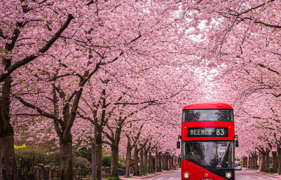 이월드 봄 시즌 대표 포토존! 새빨간 이층 버스와 벚꽃 나무가 어우러져 유럽 감성 가득한 사진을 남길 수 있어요. 로우 앵글로 촬영하면 더욱 벚꽃이 풍성하게 담겨요. - 라라랜드 하트 포토존